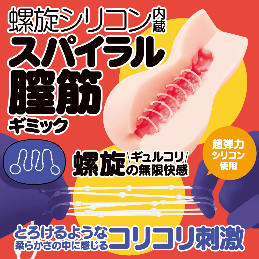 Feel your tits! Crunchy pleasure! This masturbator features a soft, fluffy, raw meat with a built-in spiral silicone for a truly taut, squishy feel! The meltingly soft texture and the crunchy sensation are just like vaginal muscles!? Enjoy the endless pleasure of the spiral that squeezes and wraps around you with every thrust! The substantial, thick meat weighs approximately 580g, providing a satisfying insertion experience! The two-layer "flesh wall dipping" structure not only provides a realistic insertion feel, but also prevents the built-in silicone from peeling, making it highly durable.