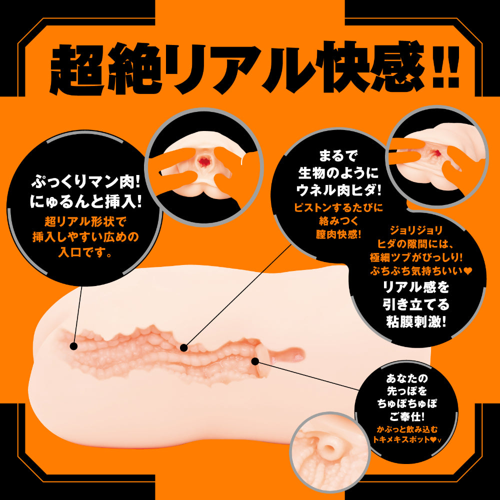 The plump slit that is the maximum level of excitement also stimulates your imagination. High elasticity and excellent durability! The tight human skin feel is irresistible! Because it comes into direct contact with the skin, it is made of high-quality elastomer that is particular about safety and feel. And the feeling of insertion is... a super realistic internal structure with wriggling folds! The vaginal meat pleasure that entangles every time the folds of the wriggling flesh piston like a living thing! The gaps between the folds are filled with extremely fine grains!