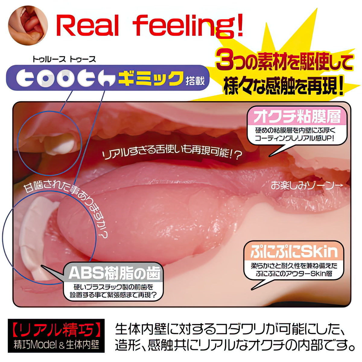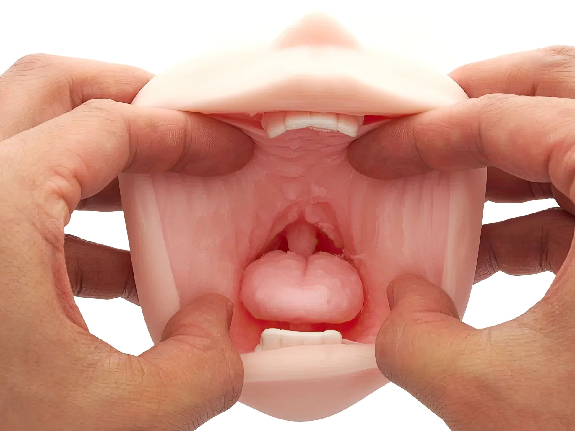 The front of the toy has soft, inviting lips, hiding a harder set of plastic teeth. Ribbed textures on the roof of the mouth and tongue, entice you to slide your member in. Push further, and you'll feel why this toy is as famous as it is. Mimicking a fantastic deepthroat experience, the hole tightens the further you press in, adding a small amount of suction to the tip. You won't last long.
