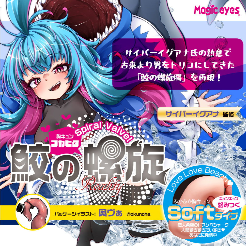 This is a collaboration hole supervised by Cyber Iguana, a special lister of JINGAI goods. The seven-turn spiral folds of the shark girl, which can be twisted like a towel, are reproduced with a non-penetrating vacuum. The illustrations on the package are by "Okuva" and the bonus illustration card is by "Mick", making this a luxurious product that has caused a stir in the area. The main body, which has a volume of 680g, is a very practical product that will satisfy everyone from beginners to maniacs. Choose from two types, soft and hard, to suit your taste.