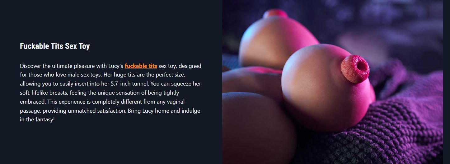 Discover the ultimate pleasure with Lucy's fuckable tits sex toy, designed for those who love male sex toys. Her huge tits are the perfect size, allowing you to easily insert into her 5.7-inch tunnel. You can squeeze her soft, lifelike breasts, feeling the unique sensation of being tightly embraced. This experience is completely different from any vaginal passage, providing unmatched satisfaction. Bring Lucy home and indulge in the fantasy!