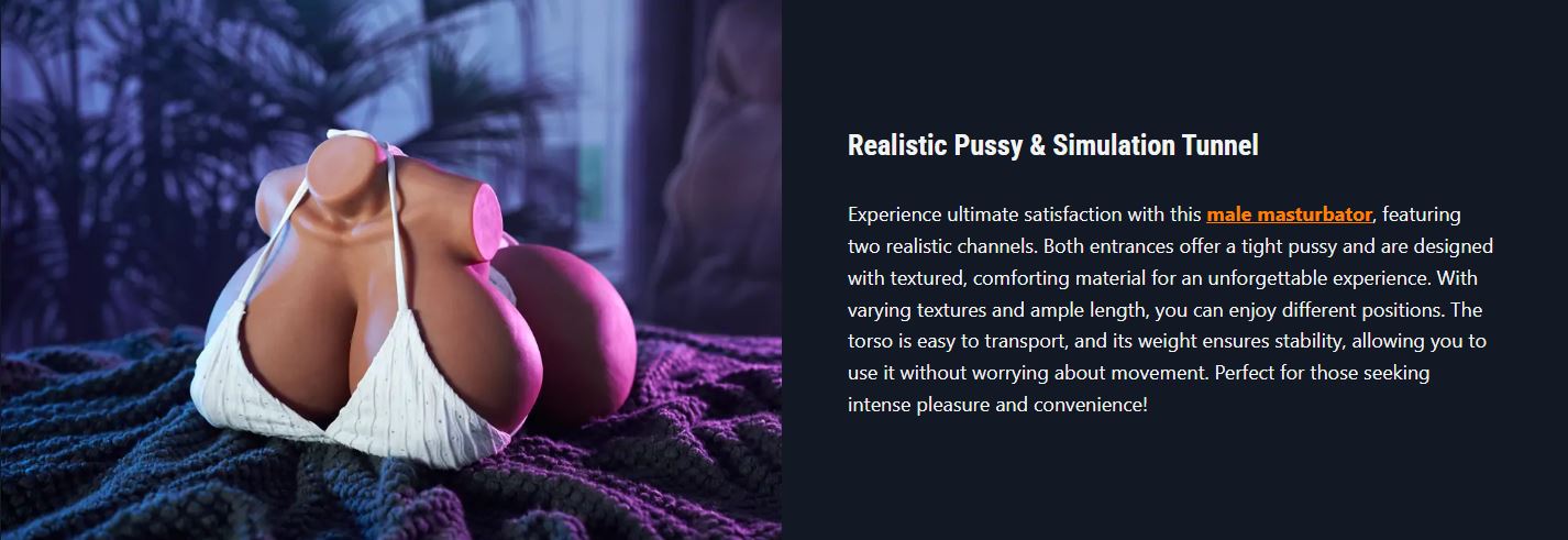 This torso sex doll features two realistic channels, both tight and textured for maximum comfort and pleasure. The varying textures provide a unique experience with every use. Easy to transport and set down, it stays in place for hands-free enjoyment. With perfect tits and a pink pussy, this toy ensures intense satisfaction every time!