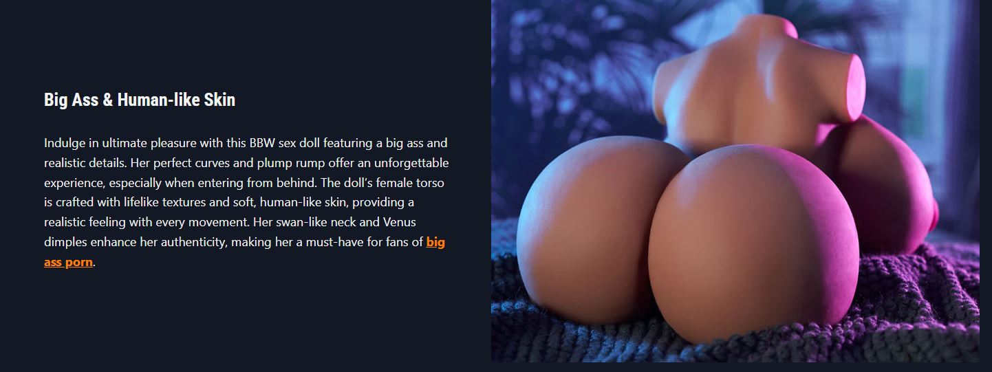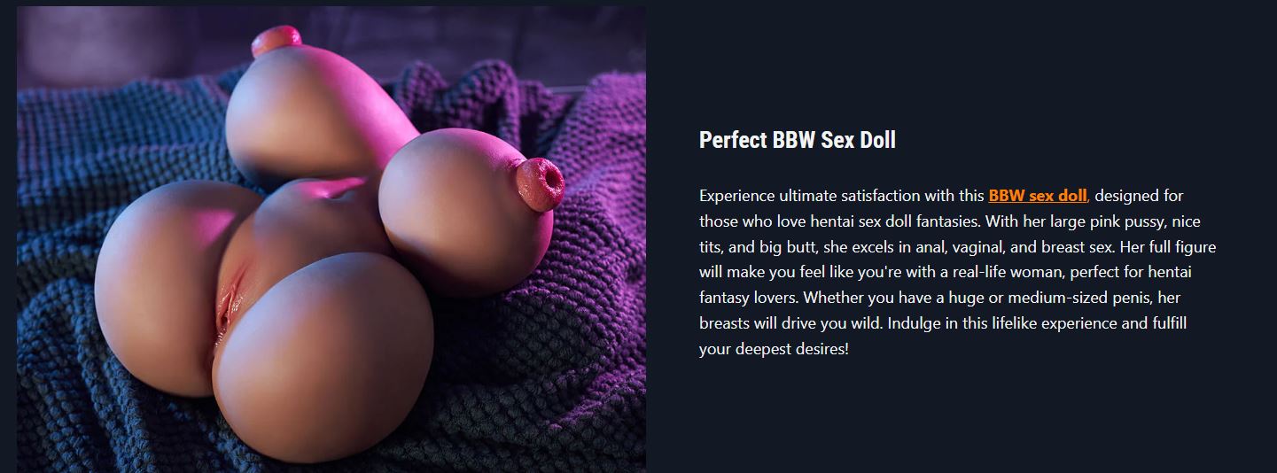 Experience ultimate satisfaction with this BBW sex doll, designed for those who love hentai sex doll fantasies. With her large pink pussy, nice tits, and big butt, she excels in anal, vaginal, and breast sex. Her full figure will make you feel like you're with a real-life woman, perfect for hentai fantasy lovers. Whether you have a huge or medium-sized penis, her breasts will drive you wild. Indulge in this lifelike experience and fulfill your deepest desires!