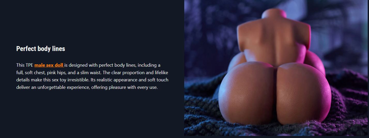 This TPE male sex doll is designed with perfect body lines, including a full, soft chest, pink hips, and a slim waist. The clear proportion and lifelike details make this sex toy irresistible. Its realistic appearance and soft touch deliver an unforgettable experience, offering pleasure with every use.