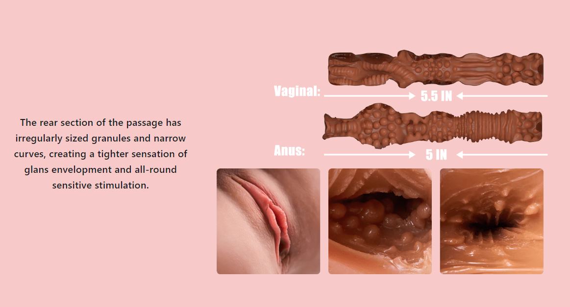With the double channel, it is designed to simulate the tactile sensation of your anal sphincter and rectum. The dense circles along with the loose and narrow variations in the front section allow for a sucking sensation with multiple penetrating stimulation during penis insertion.