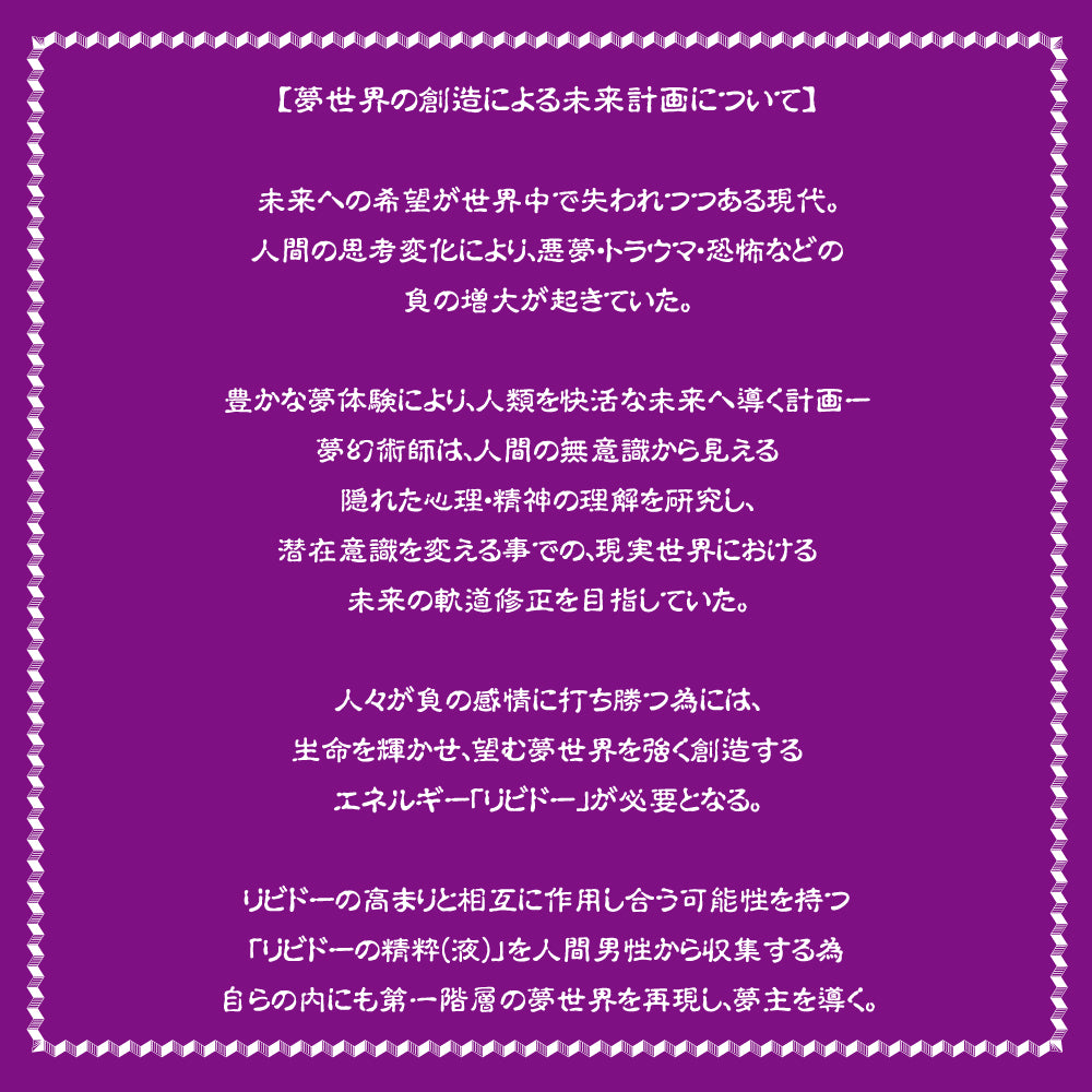A plan to lead humanity towards a brighter future through richer dream experiences. The Dream Illusionist studies the hidden psychology and spirit that can be seen in the human unconscious, and aims to correct the course of the future in the real world by changing the subconscious.